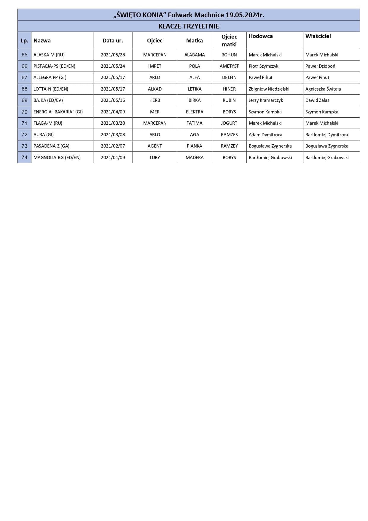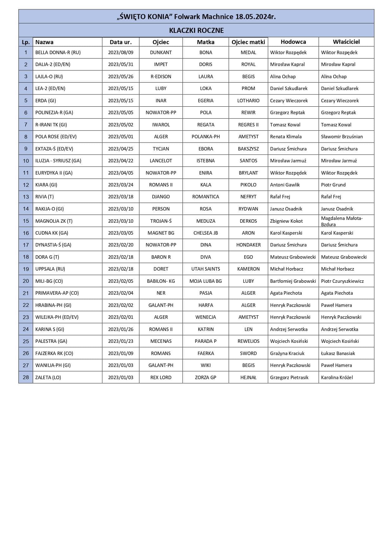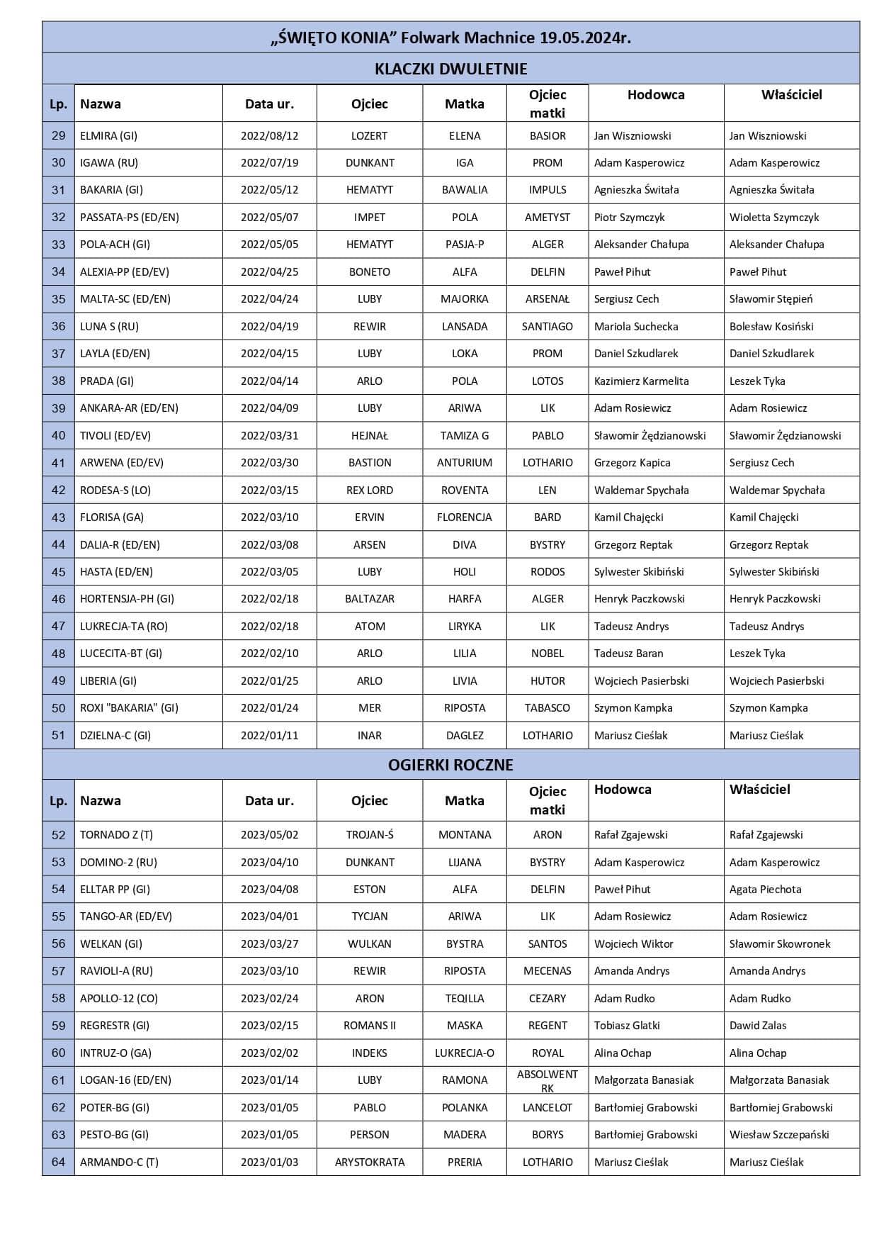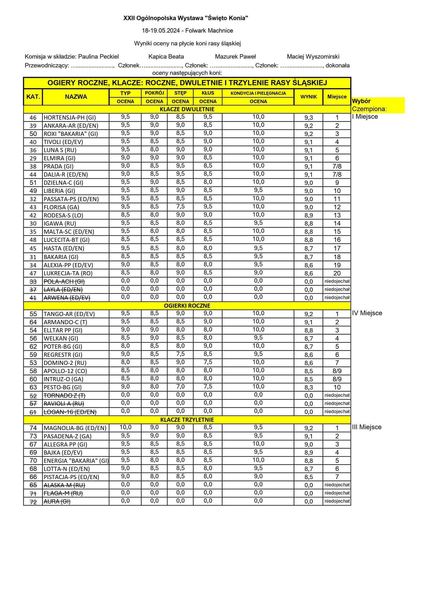 Powyżej udostępniamy listy startowe oraz wyniki z XXII Ogólnopolskiej Wystawa „Święto Konia” Machnice 2024 r.